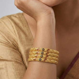 To keep your 1 gram gold bangles looking like new, avoid contact with perfumes and soaps. Wipe them with a soft, dry cloth after use and store them in a separate pouch.
