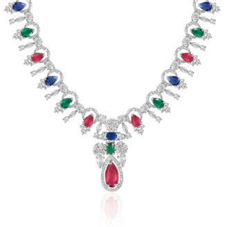 A vibrant AD necklace set with multi-color stones and a sleek rhodium polish, perfect for festive occasions and stylish ethnic wear.