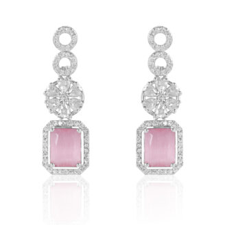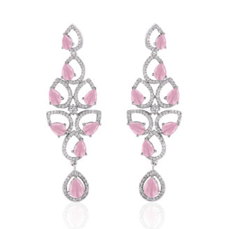 Designed with delicate pink stones and rhodium plating, this AD necklace set offers a soft, feminine charm for festive and wedding looks.