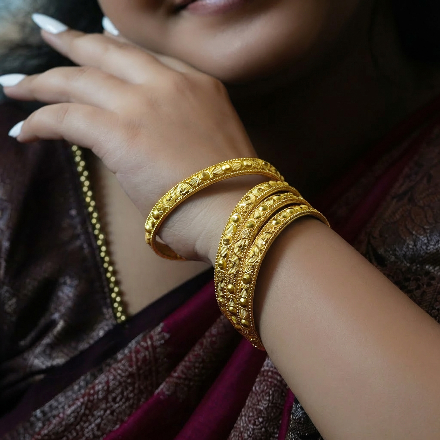 Graceful gold plated bangles designed for bridal and festive looks. These stylish bangles for girls add a classic touch to sarees and traditional outfits.