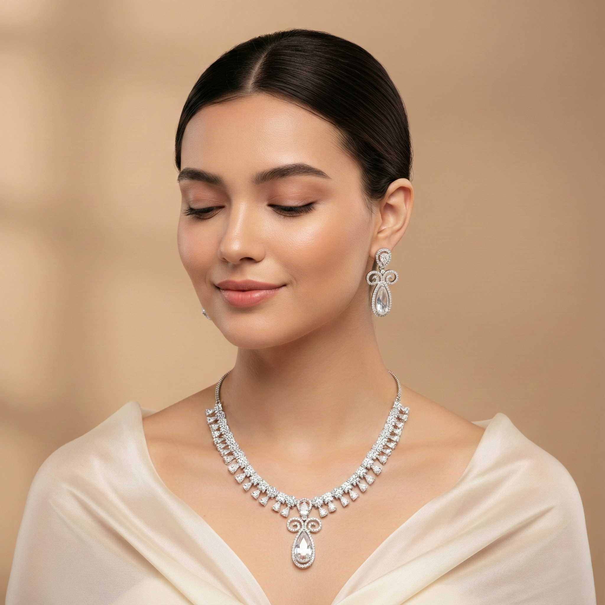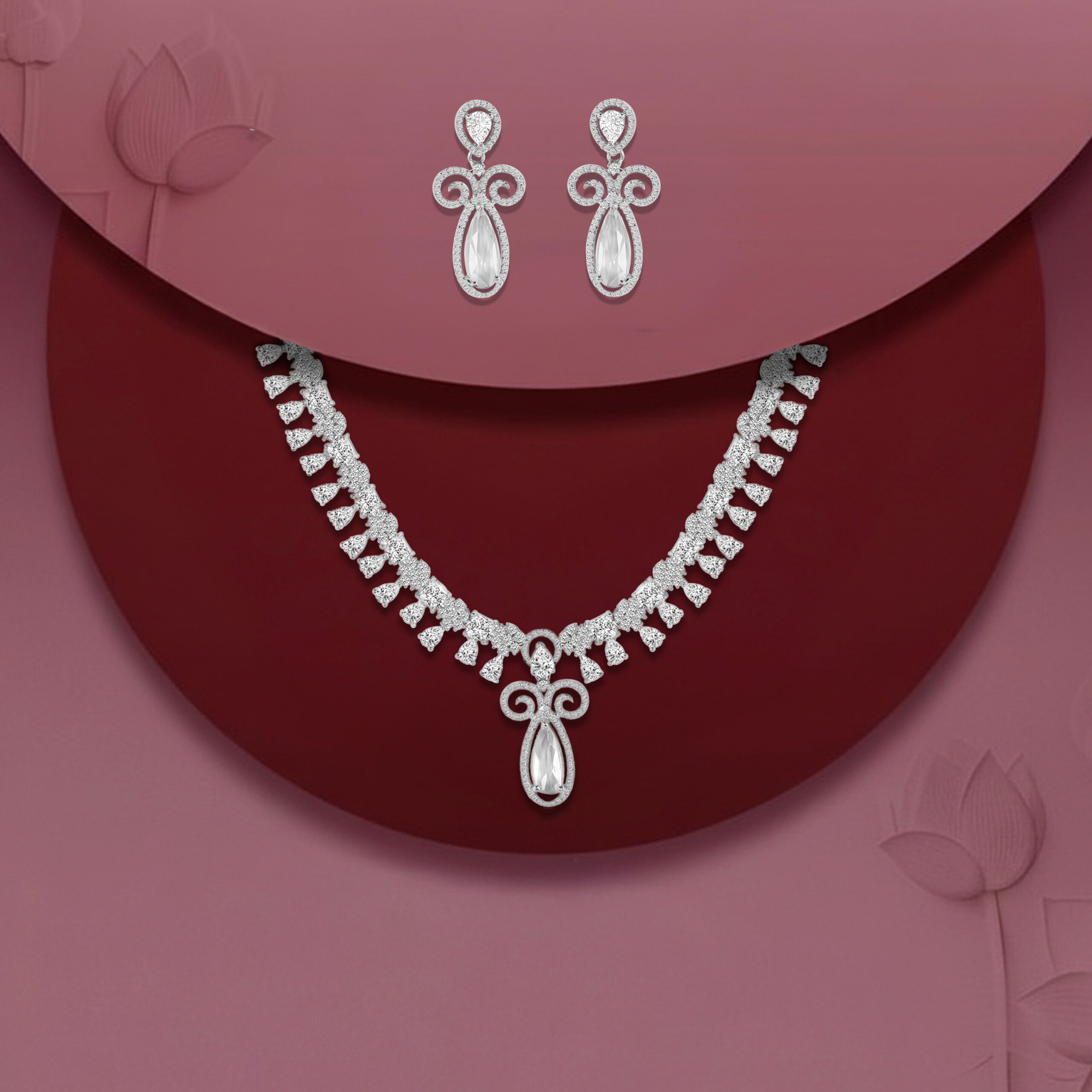 Elegant White Stone AD Necklace Set – Rhodium Finish | Jecy Jewels