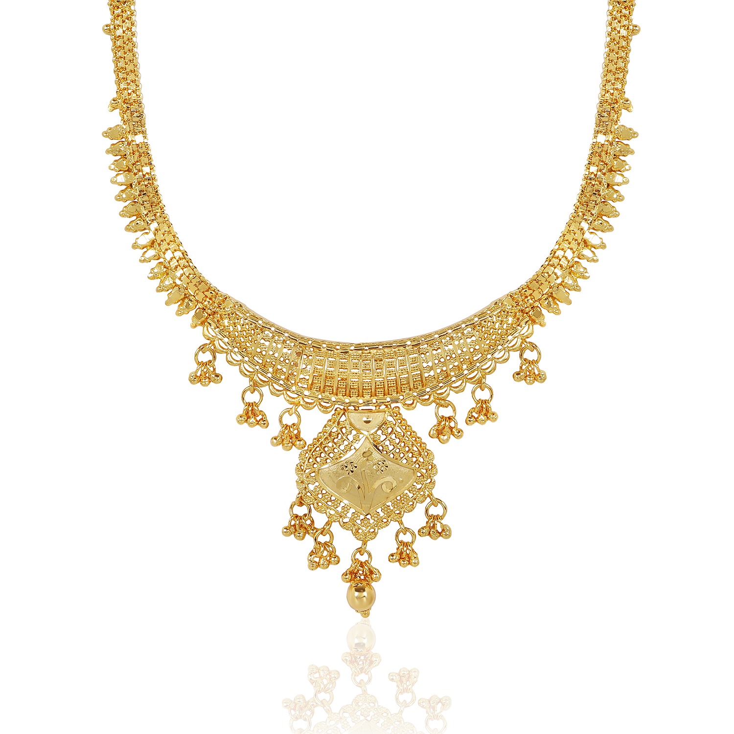 Bring a radiant touch to your traditional look with this Golden Glow necklace set. Crafted with premium micro plating, it ensures a rich gold finish for weddings and cultural events.