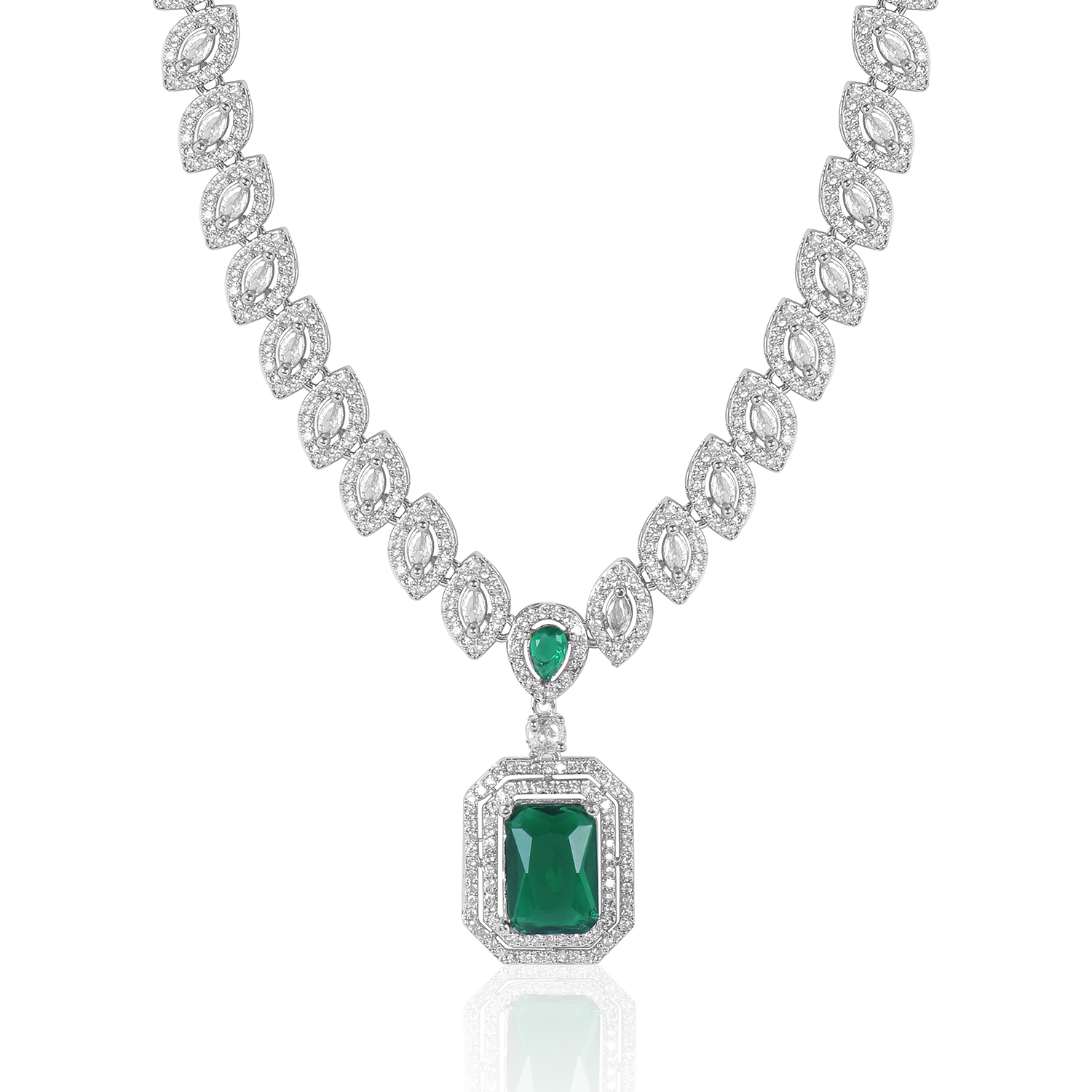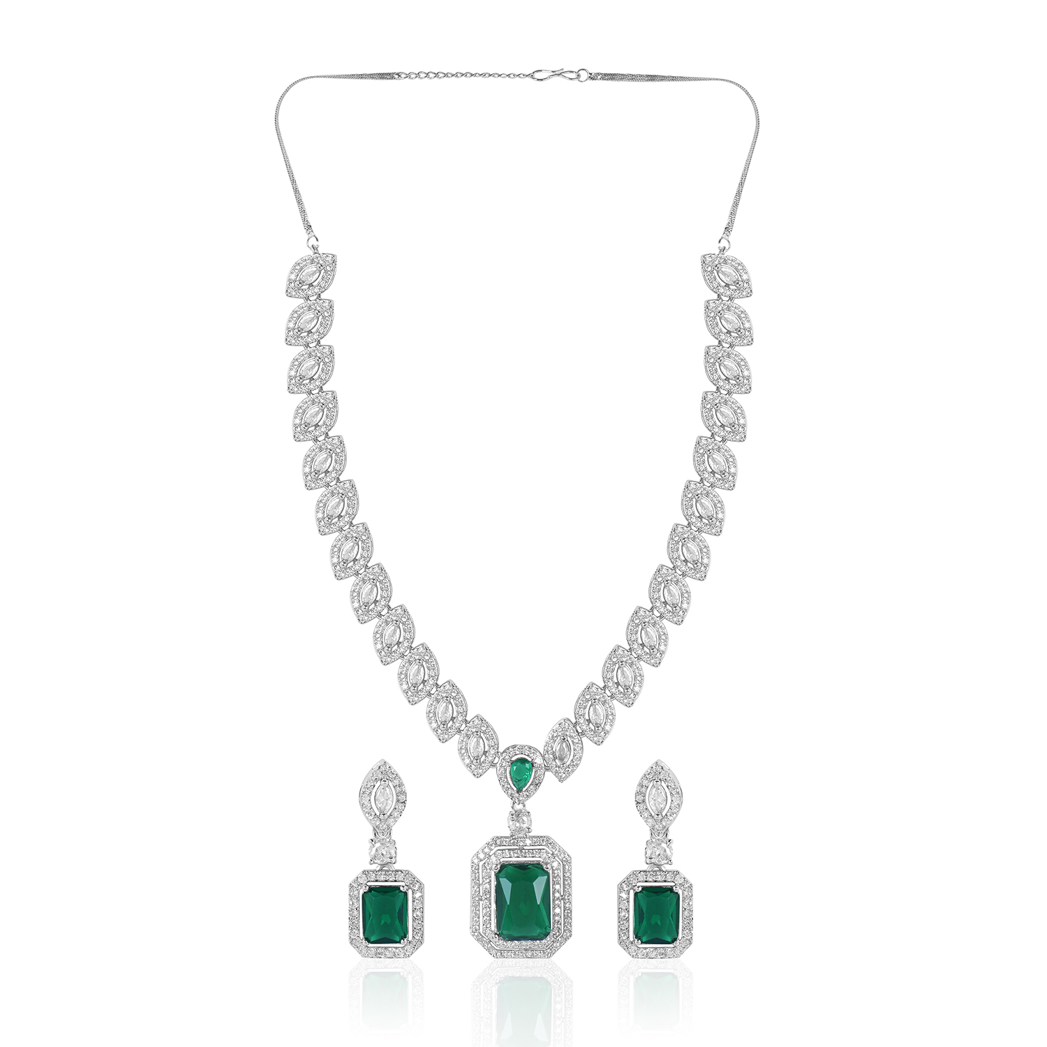 Graceful Green Stone AD Necklace Set – Rhodium Polish