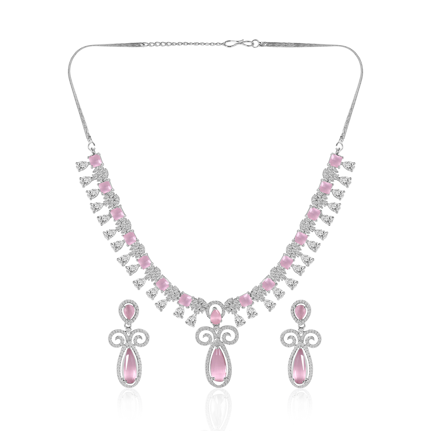 Graceful Pink Stone AD Necklace Set – Rhodium Finish