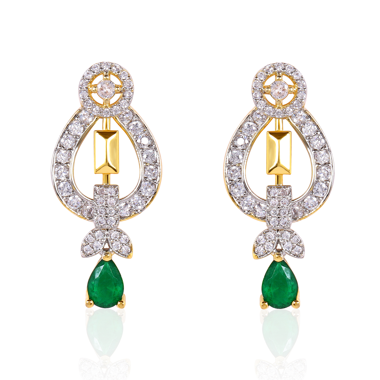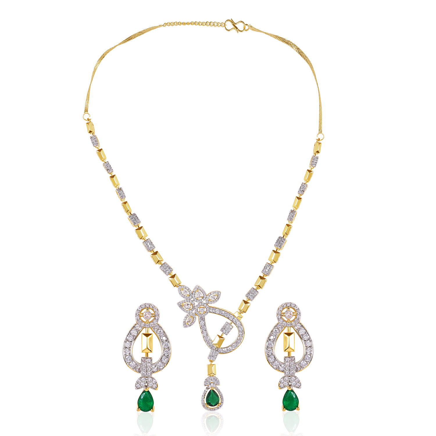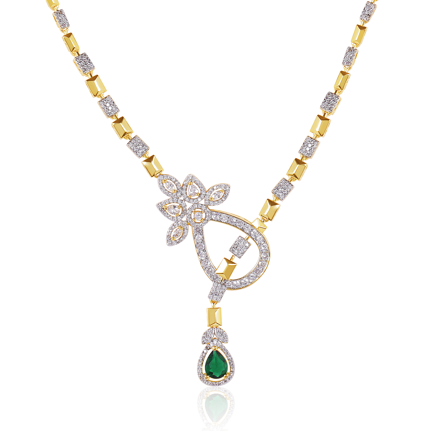 Adorned with green stones, this gold plated AD necklace set offers a traditional yet graceful look for weddings and festive wear.