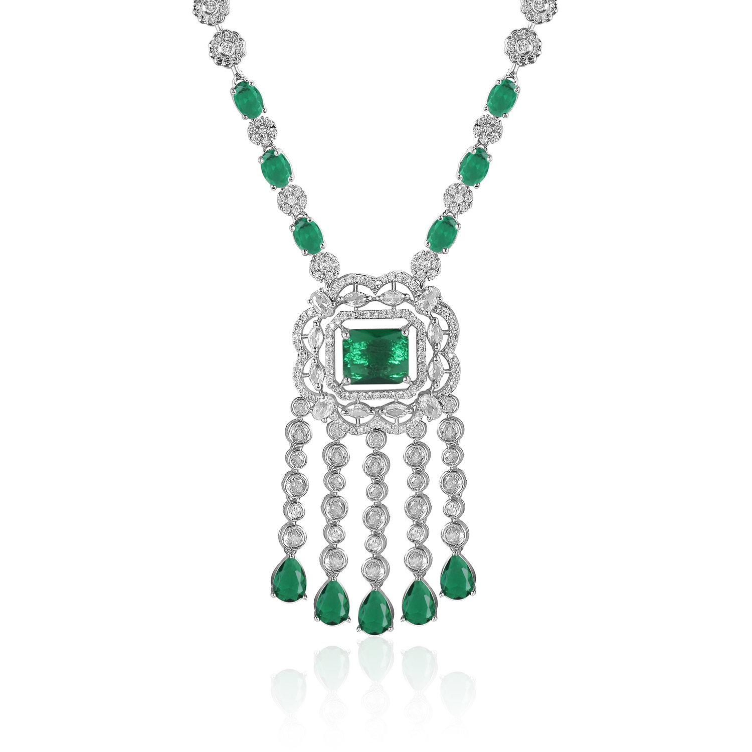 Featuring rich green stones, this rhodium plated AD necklace set offers a regal look, perfect for traditional and festive celebrations.