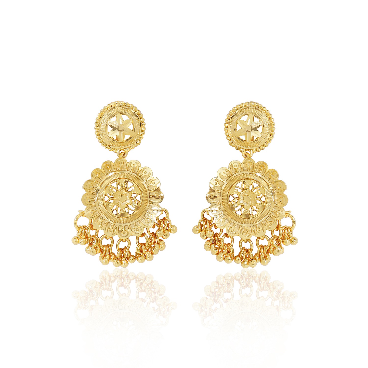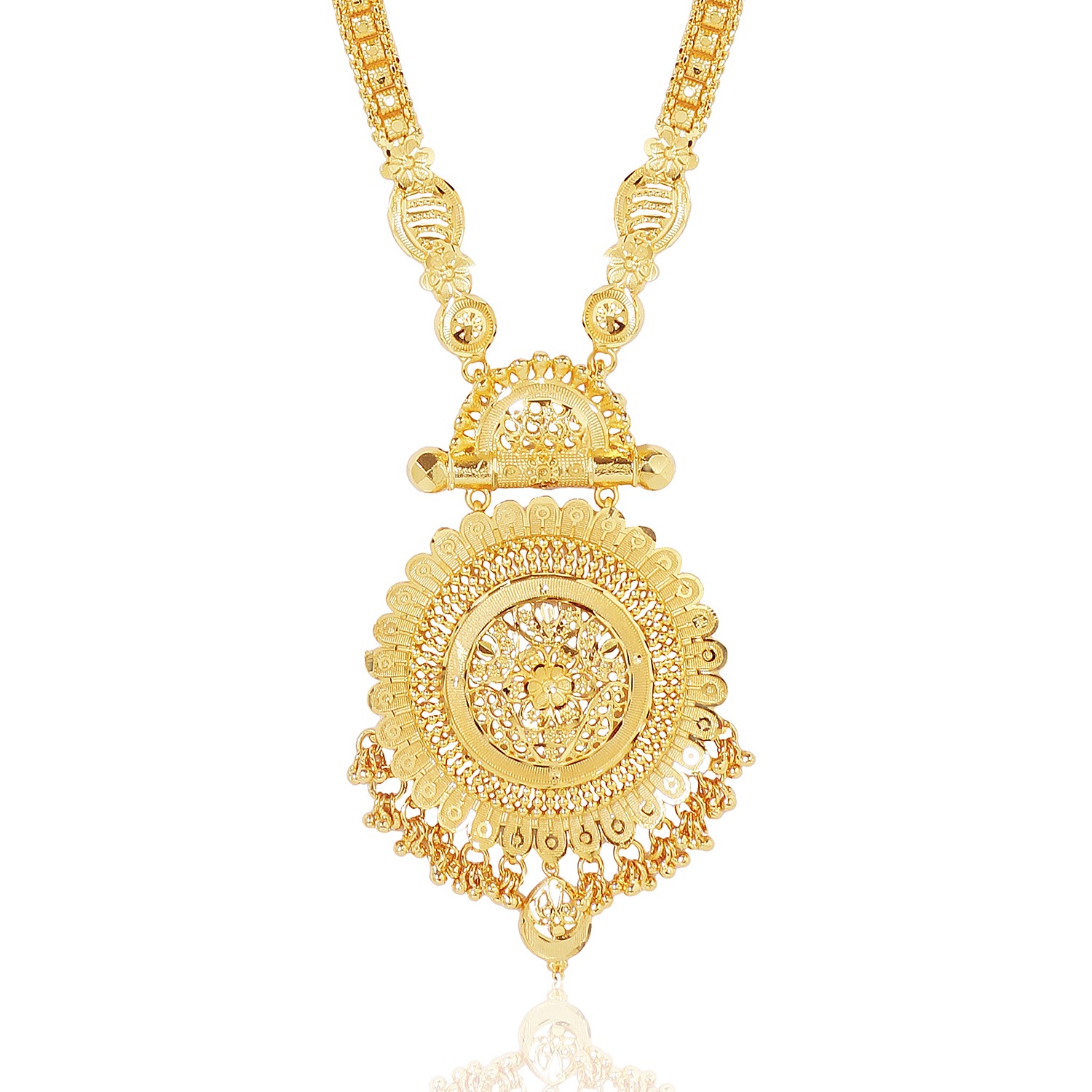 Celebrate timeless beauty with this Heritage Gold long necklace set, designed for weddings and grand occasions. The fine micro plating ensures a rich golden glow that elevates your traditional ensembles.