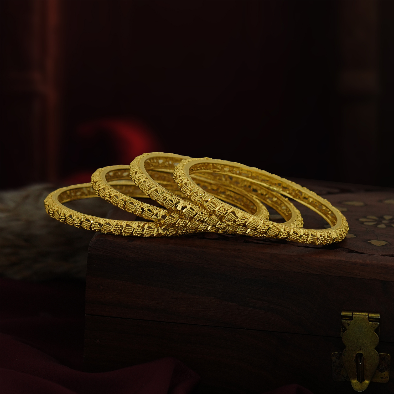 Inspired by nature, these leaf-patterned bangles add a delicate yet regal touch to your wrists. Ideal for weddings and celebrations, they feature a luxurious gold plated finish.