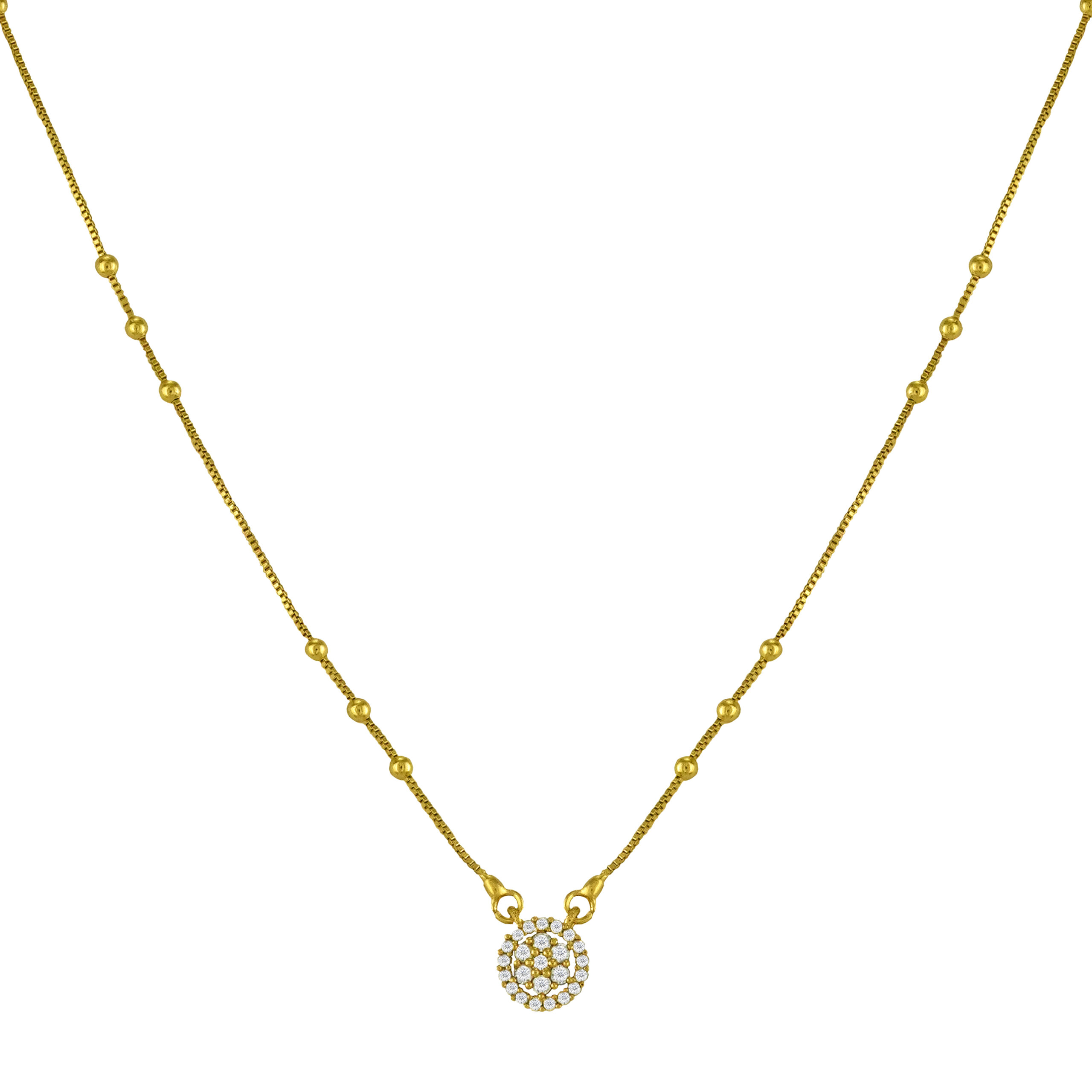 A lightweight one gram gold plated chain with pendant offering shine and simplicity. Designed for everyday pairing with ethnic, contemporary, and minimal outfits.