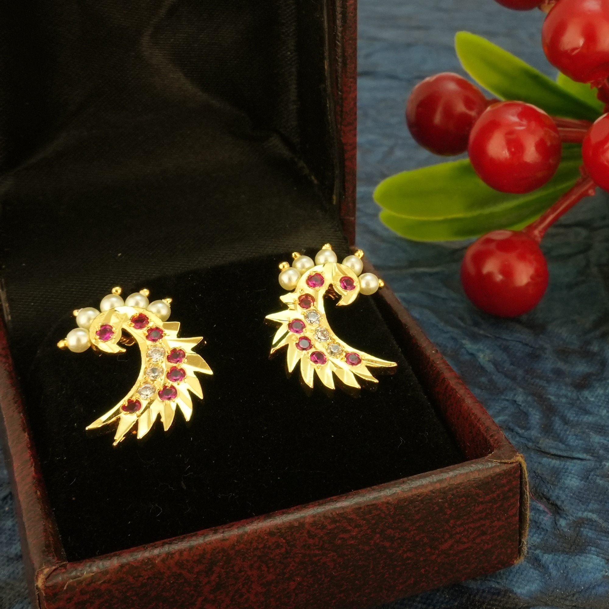 A premium designer piece, these one gram gold plated earrings bring sophistication and charm to weddings, parties, and festive occasions.