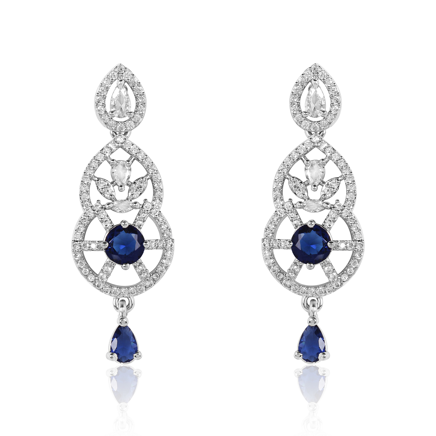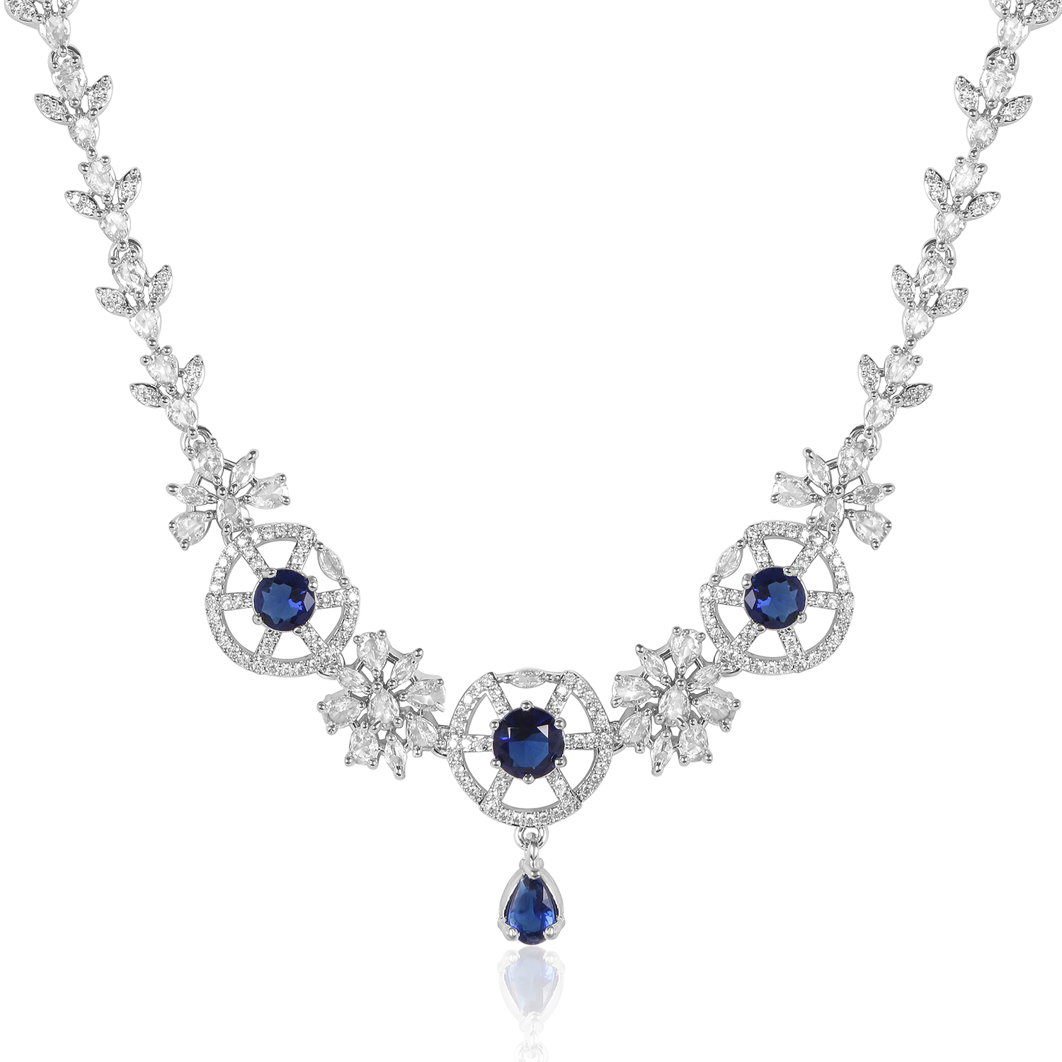 This AD necklace set features sparkling blue stones in a glossy rhodium finish, making it a stunning choice for special occasions.