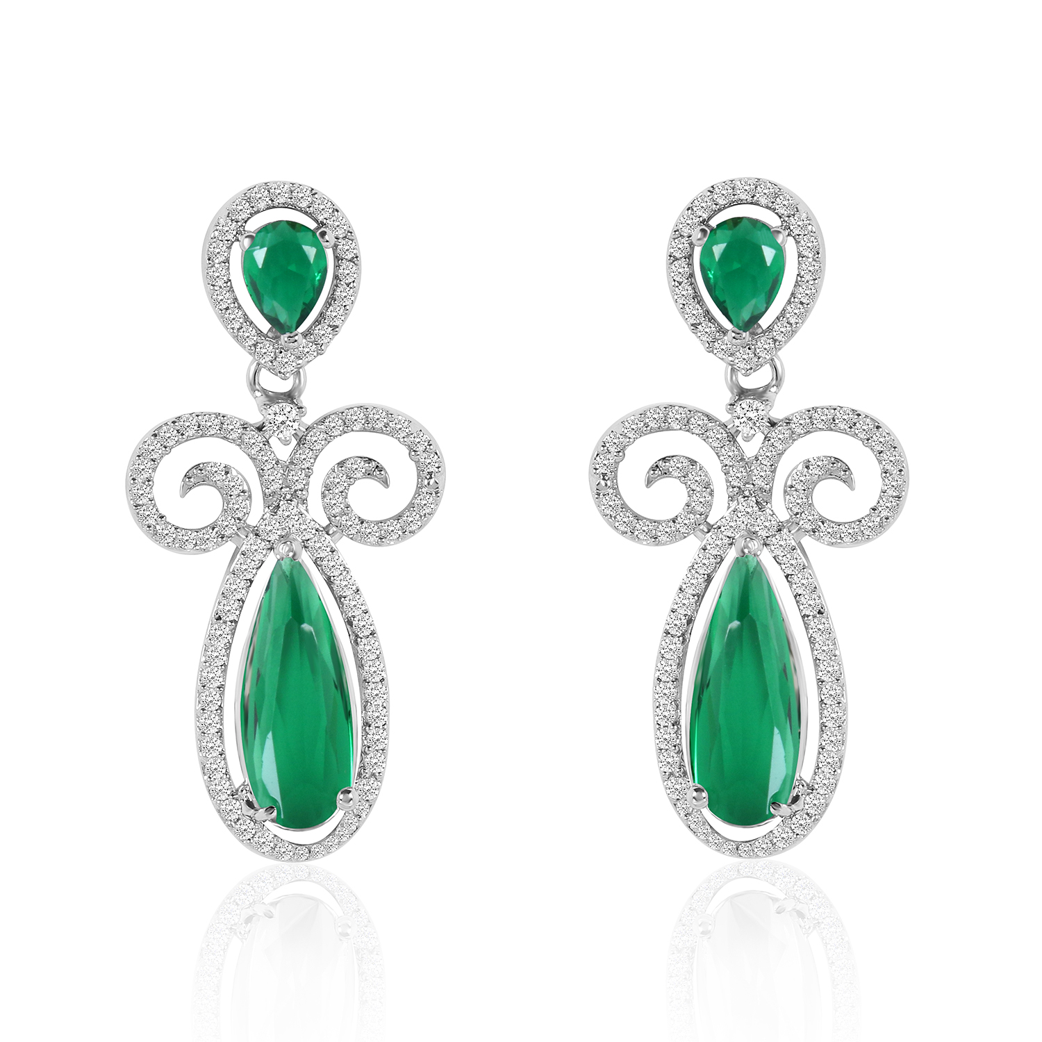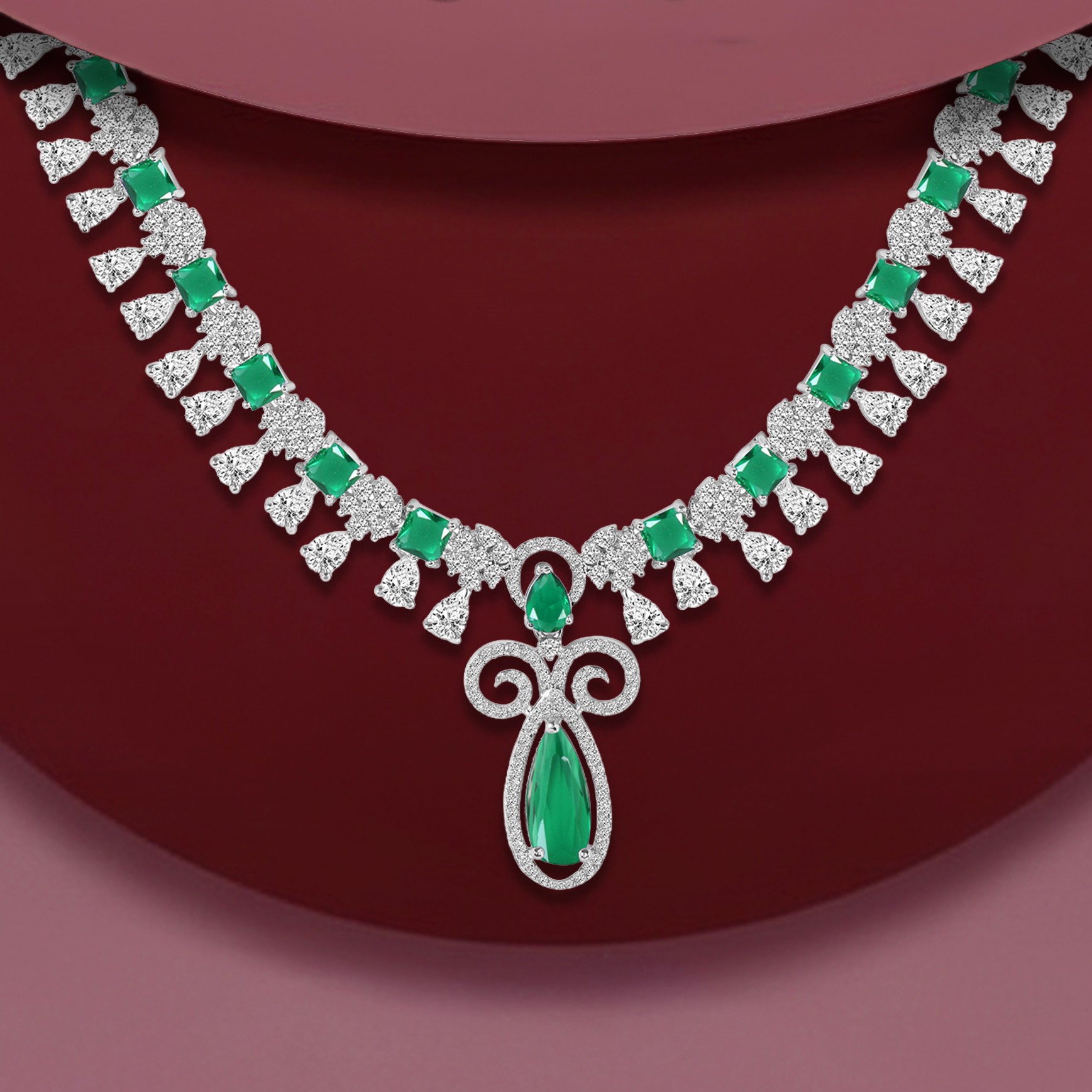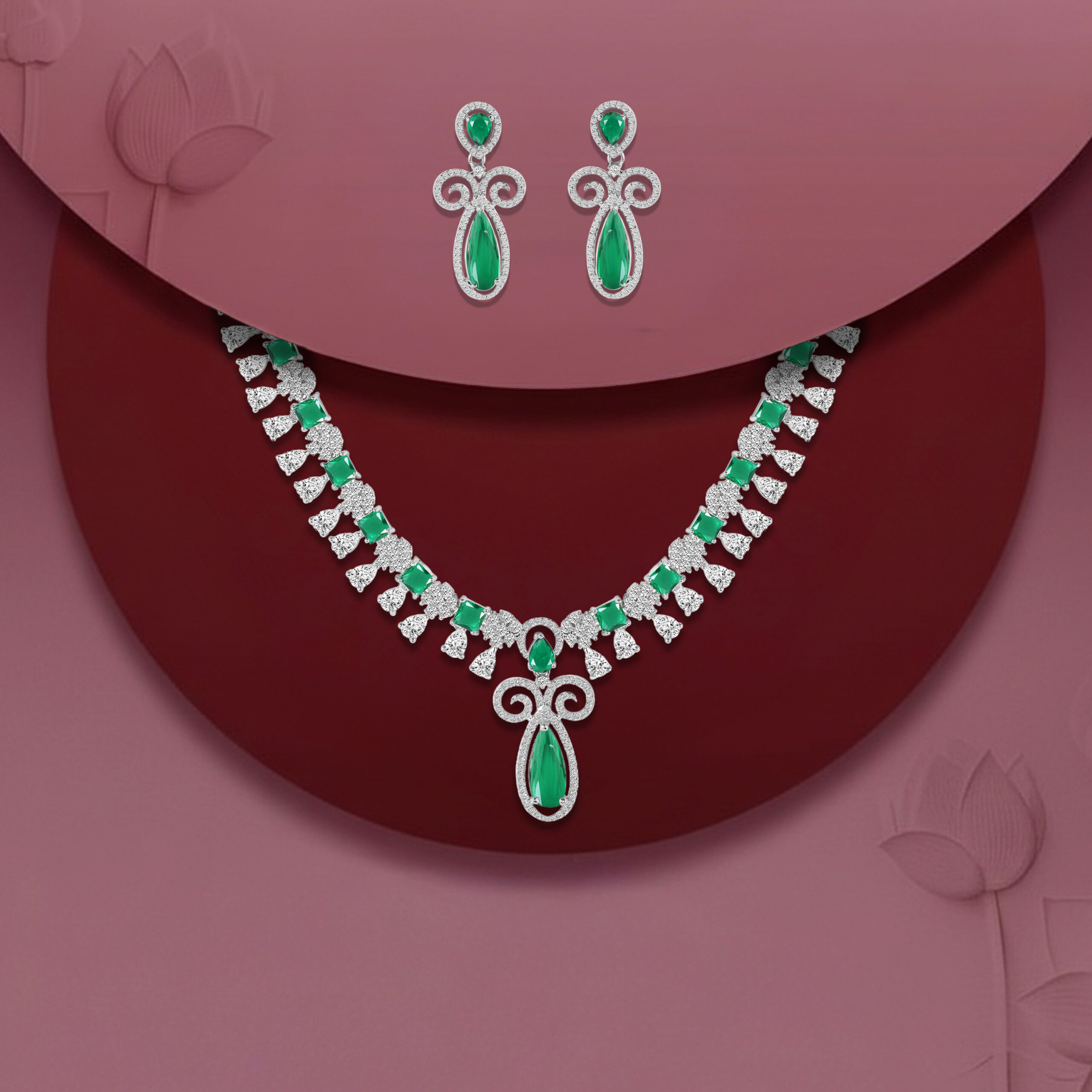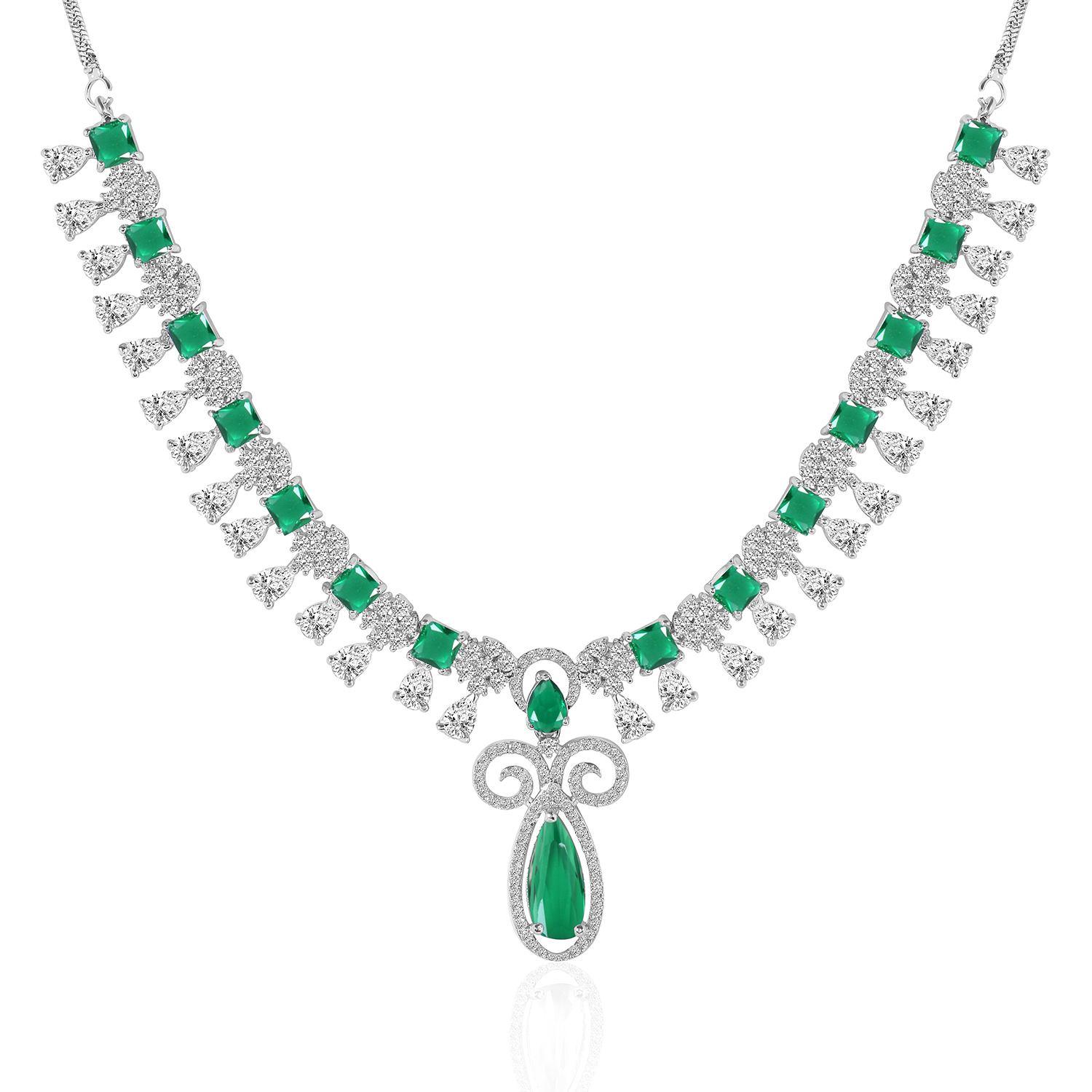 Royal Green Stone AD Necklace Set – Rhodium Finish | Jecy Jewels